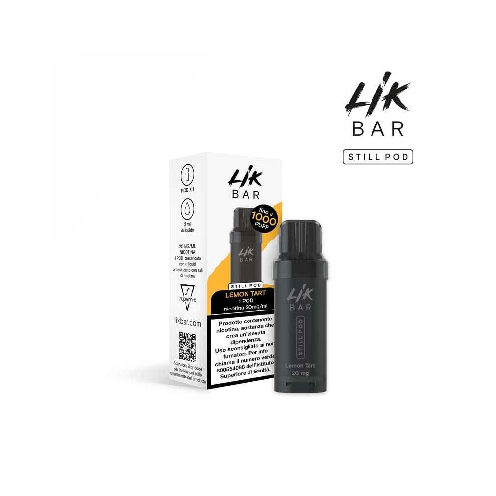 La STILL POD per Sigaretta Elettronica STILL al Gusto LEMON TART di SUPREM-E è una POD precaricata al gusto dolce e acidulo di crostata al limone, compatibile con la Sigaretta Elettronica LIK BAR STILL. Le STILL POD sono intercambiabili e pre-caricate con 2 ML di Liquido Pronto Senza Nicotina e Nicotina 10 e 20 e sono in grado di offrire fino a 1000 puff. Sono compatibili con le Batterie STILL, disponibili in varie colorazioni. La POD è compatibile con le Batterie STILL da 400mAh che si ricaricano rapidamente in 15 minuti tramite porta USB-C, garantendo un utilizzo continuo. Il funzionamento automatico consente di attivare la vaporizzazione semplicemente aspirando dal DRIP TIP. Per utilizzare il dispositivo, inserire la POD precaricata e iniziare a Svapare. Una volta esaurito il liquido, è possibile sostituire la POD con una nuova, disponibile separatamente. La POD esaurita va gettata nella raccolta differenziata (RAEE).
